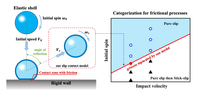 研究表明,旋转球壳碰撞过程中的能量耗散主要来源于摩擦作用,而初始旋转速度与摩擦系数共同决定了接触界面的摩擦状态:可分为全程“纯滑动”和先滑动后“黏滑”两种模式。这一机理揭示了不同旋转条件与速度下碰撞体反弹行为存在显著差异的原因。一个直观的例子是乒乓球运动员通过施加不同旋转以精确控制球在桌面的弹跳轨迹与速度。研究团队在此基础上改进了碰撞动力学模型,提出了更高精度的接触时间预测方法,并确立了从纯滑动向黏滑状态转变的临界条件。研究结果显示,当初始旋转速度较高或摩擦系数较小时,系统倾向于保持纯滑动状态;而在相反条件下,则会出现黏滑混合状态,甚至发生摩擦力反向的复杂动力学现象。相关成果以“Rotational collision dynamics of a spherical shell: frictional dissipation and stick-slip transition”为题发表于力学重要期刊《International Journal of Solids and Structures》。
