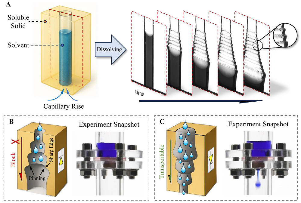 图1. 液体二极管的形成以及特性说明。(A) 溶解导致的接触线失稳将毛细圆管塑造为内部具有周期性棘轮结构的液体二极管;(B, C) 液体二极管的定向输运特性。毛细管内只允许液体从宽端流向窄端,当流动方向相反时,棘轮结构阻碍液体流动