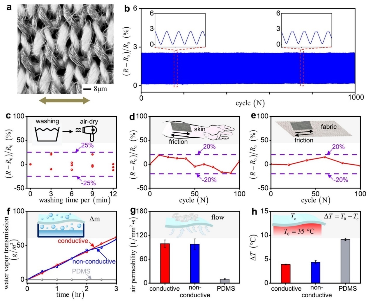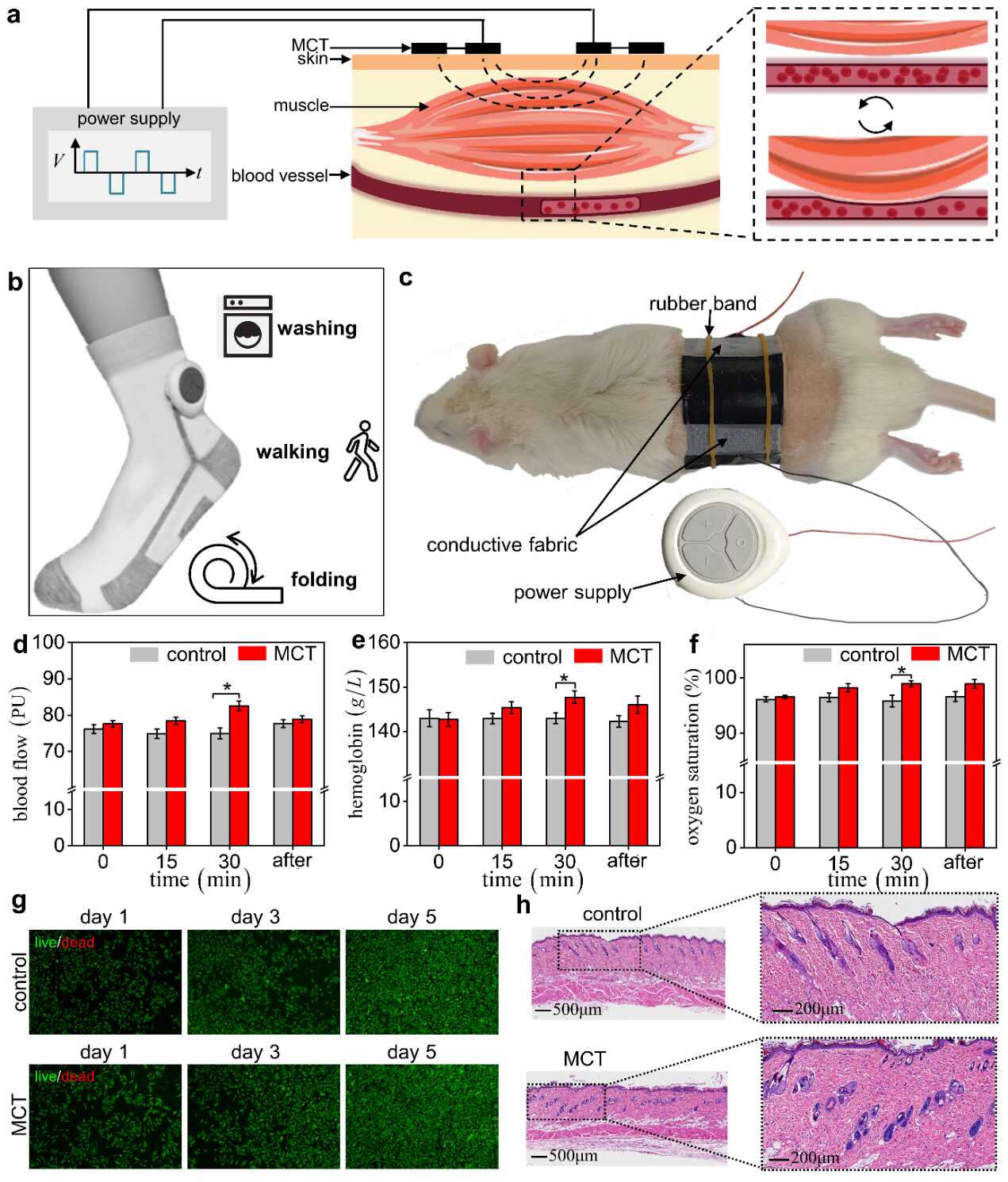 研究团队提出了一种用于MCT的具有多级针织结构的导电织物设计,其表现出优异的电性能、透气性和舒适性(图1)。为满足MCT严格的电学要求,建立了具有多级结构的导电织物电阻-应变关系的解析模型,为织物的设计和制备提供指导(图2)。此外,实验结果表明,导电织物表现出优异的可重复性、透气性和隔热性,确保了长期的治疗效果和舒适性(图3)。作为一个器件级的例子,导电织物被用于制作可穿戴MCT袜子,其具有大面积处理和便携的特点。最后,动物实验证明MCT袜能有效促进血液循环,加速新陈代谢(图4)。导电织物的发展为个性化治疗提供了更加舒适、高效的治疗平台。