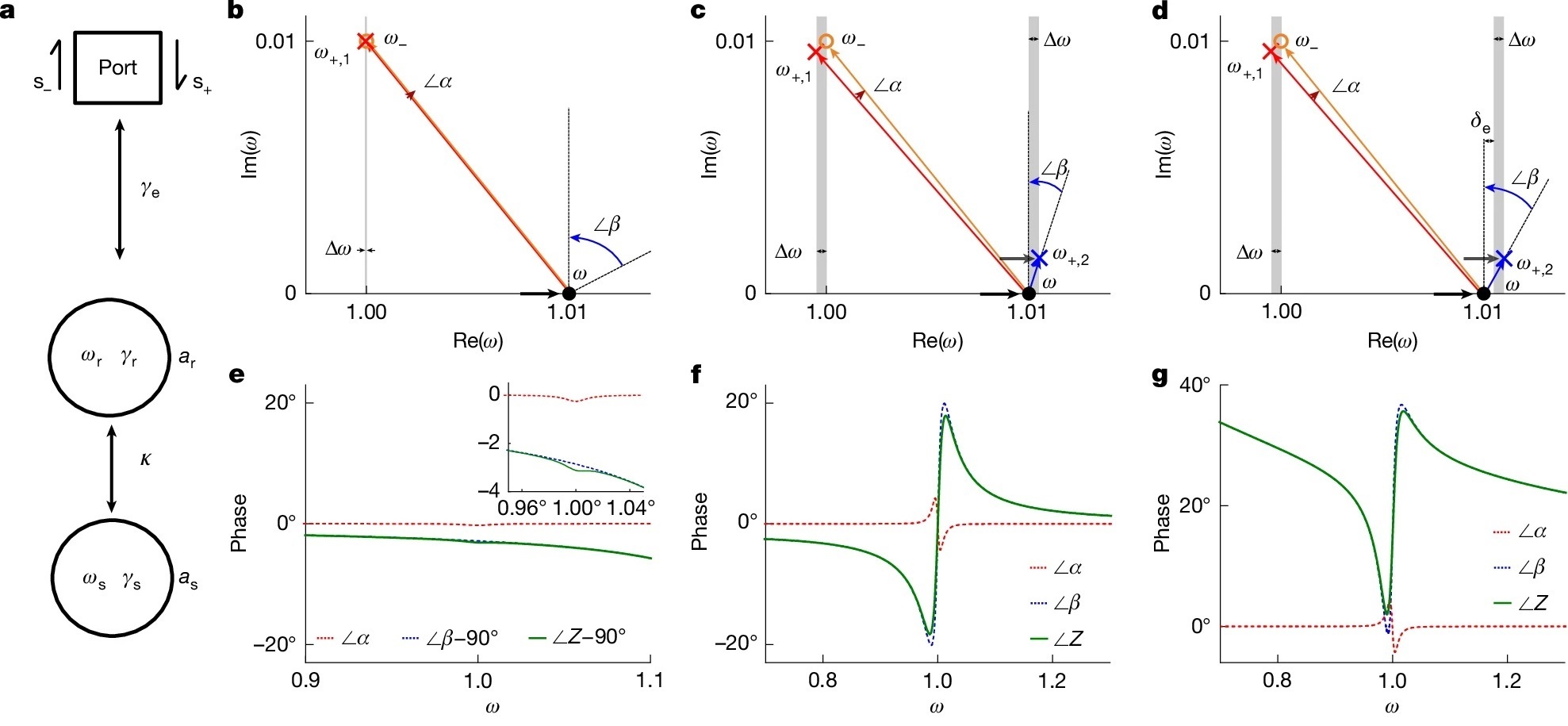 图2. 无线传感平台的读取系统设计。(a)用耦合模理论描述的系统;(b-g)不同系统的零点-极点图和读取信号对比