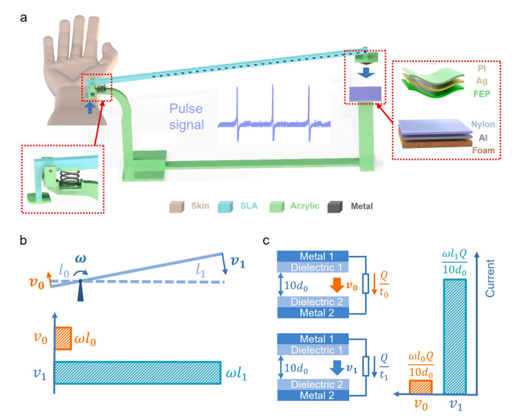 图1杠杆式摩擦纳米发电机的模型及原理图。(a)杠杆式摩擦纳米发电机的模型;(b)角速度原理图;(c)摩擦纳米发电机的电流原理图。