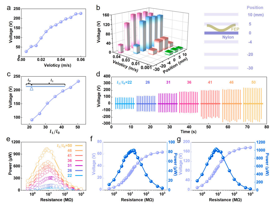 图2 杠杆式摩擦纳米发电机的电学测量。(a)不同速度下和(b)不同位置下的信号测试;不同放大倍数下的(c)信号图和(d)信号波形图;(e)不同放大倍数下的功率图;(f)22倍和(g)50倍放大下的电压功率图。