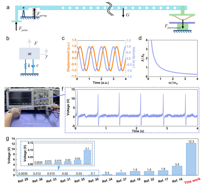 图3 杠杆式摩擦纳米发电机的力学分析及脉搏测量应用展示。(a)杠杆式摩擦纳米发电机的力学分析;(b)杠杆式摩擦纳米发电机的动力学模型;杠杆式摩擦纳米发电机的(c)位移-速度-时间图和(d)幅度比-固有频率比图;杠杆式摩擦纳米发电机测量脉搏的(e)实物图和(f)信号图;(g)杠杆式摩擦纳米发电机测的脉搏信号大小和其他文献的对比。
