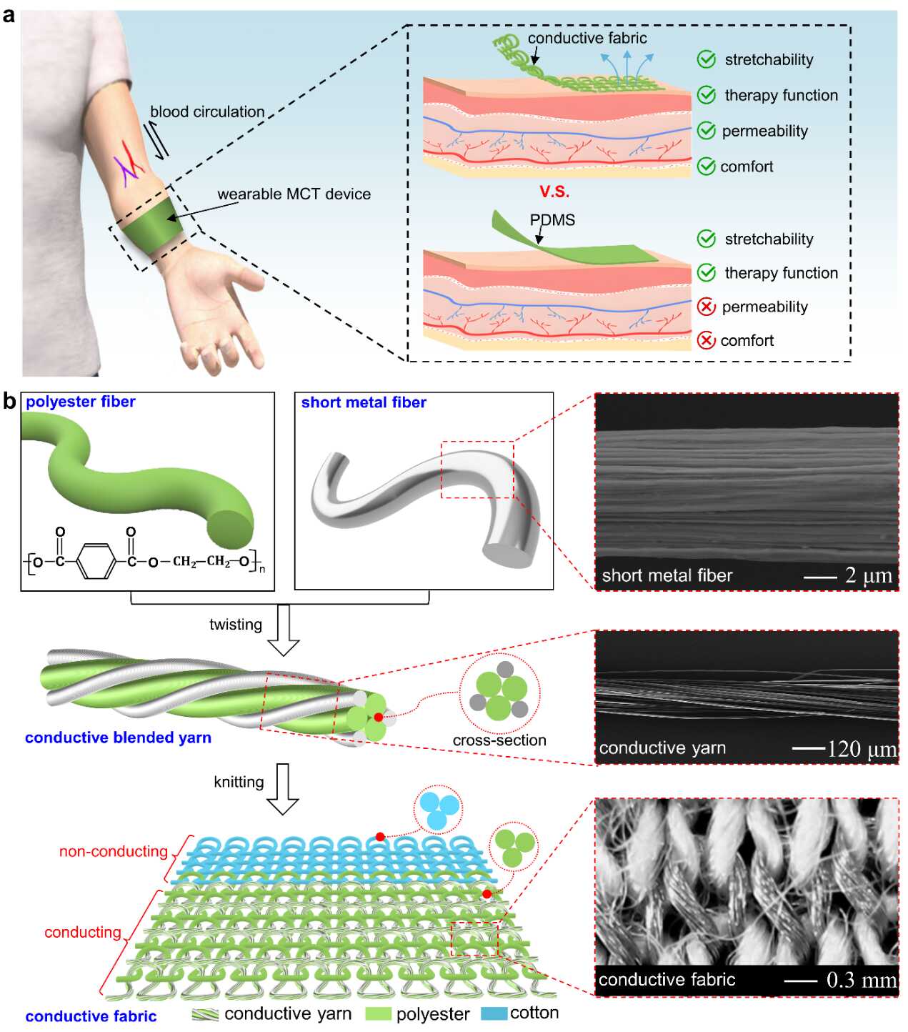 研究团队提出了一种用于MCT的具有多级针织结构的导电织物设计,其表现出优异的电性能、透气性和舒适性(图1)。为满足MCT严格的电学要求,建立了具有多级结构的导电织物电阻-应变关系的解析模型,为织物的设计和制备提供指导(图2)。此外,实验结果表明,导电织物表现出优异的可重复性、透气性和隔热性,确保了长期的治疗效果和舒适性(图3)。作为一个器件级的例子,导电织物被用于制作可穿戴MCT袜子,其具有大面积处理和便携的特点。最后,动物实验证明MCT袜能有效促进血液循环,加速新陈代谢(图4)。导电织物的发展为个性化治疗提供了更加舒适、高效的治疗平台。