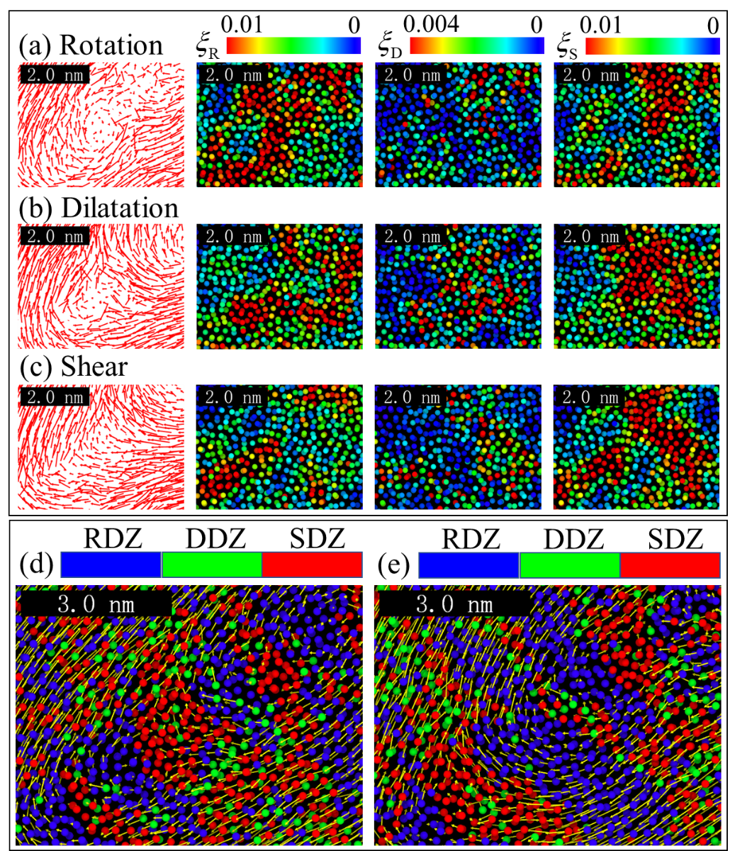 近期,中科院力学所戴兰宏研究团队在该问题研究上取得新进展。基于连续介质力学理论框架,研究人员首先提出了一个同时考虑仿射和非仿射变形信息的两项梯度模型(Two-term gradient model, TTG模型),可以完整地描述无序固体介质的局部变形场,突破了目前广泛使用的单纯仿射或非仿射模型的局限。研究人员进一步完成了对剪切、体胀、旋转这三个高度纠缠的局域运动的解耦,并在原子尺度上定义了全新的局部剪切、体胀、旋转运动事件的定量描述符。为了表征这三类原子团簇运动,提出了剪切主导区(shear dominated zone, SDZ)、体胀主导区(dilatation dominated zone, DDZ)及旋转主导区(rotation dominated zone,RDZ)的概念和定量表征方法,克服了目前流行的剪切转变区(shear transformation zone, STZ)不能表征原子团簇旋转运动和定量描述体胀运动的不足。在此基础上,研究人员利用大规模分子动力学模拟,对非晶合金从均匀变形到局部化剪切带涌现全过程进行精细表征。通过追踪SDZ、DDZ及RDZ原子团簇运动演化时空序列,发现初始宏观均匀变形阶段剪切、体胀及旋转团簇运动事件呈现出类似“军队行动”式的步调协同一致行为,具体表现为SDZ、DDZ及RDZ在空间离散的“类液”软区随机同步激活。基于统计学的极值理论分析,研究人员发现在这个阶段,体胀局域运动事件较剪切和旋转事件的空间分布展现出更明显的非高斯长拖尾特征,表明体胀局域化流动(DDZ)起先导的主控作用。原子团簇通过体胀运动(DDZ)完成局部软化过程,随着变形加剧,这种体胀局域软化进一步激活其邻近硬区的旋转运动,进而逐渐打破了SDZ、DDZ和RDZ三者间同步激活,转变为SDZ、DDZ及RDZ的非均匀间隔分布。增强的RDZ运动又进一步加剧了SDZ和DDZ局域运动,进而诱发硬区团簇的软化。当软化程度达到临界时,硬区壁垒被打破,激活的SDZ、DDZ及RDZ相互贯穿形成剪切带。研究人员进一步基于逾渗理论,对SDZ、DDZ及RDZ原子团簇运动事件从初期均匀变形阶段的随机离散激活到变形局部化剪切带涌现时的群体贯穿演变全过程进行定量分析,发现剪切带涌现属于定向逾渗(directed percolation),并且呈现出临界幂律标度行为。本项工作提出的两项梯度(TTG)模型及三种原子团簇运动单元(SDZ、DDZ及RDZ)新概念为无序固体介质变形定量描述提供了基本工具,所揭示的剪切带涌现过程原子尺度精细图像及临界行为为深入认知非晶合金剪切带提供了新的线索。