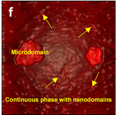 中科院力学所非线性力学国家重点实验室微纳流动研究团队通过原子力显微镜AFM实验发现DPPC(Dipalmitoylphosphatidylcholine,二棕榈酰卵磷脂,是肺表面活性剂膜的主要成分)磷脂单分子膜上存在非均匀分布的纳米凝聚相岛域(condensed phase nanodomain)结构(图1)。以往研究认为,由于相分离作用,这类磷脂膜由DPPC分子聚集成的微米尺度凝聚相岛域(microdomain)与周围的DPPC流体连续相(liquid continuous phase)共同构成。本实验不仅澄清了纳米凝聚相岛域是否存在的争议,还给出了其尺寸及间距等特征量。进而,我们测量了DPPC膜上微米凝聚相岛域的扩散,并由此获得了二维黏性磷脂膜的黏度。由于微米凝聚相的厚度与磷脂膜厚度相当,该实验体系最为接近SD和HPW模型假设的二维黏性流体,可以有效检验经典流体力学理论的有效性和磷脂膜的黏性。实验发现,磷脂膜内的扩散由局部DPPC连续相主导的短时间线性段向纳米凝聚相岛域结构影响的长时间线性段过渡(图2左);相应的,DPPC磷脂膜的黏度也由连续相微观黏度和带纳米结构的全局膜黏度共同决定。通过与理论比较,发现采用双黏度的HPW模型仍可以很好的预测不同分子密度的磷脂膜内的扩散系数(图2右)。值得强调的是,实验还发现磷脂膜内扩散的位移概率分布从短时间高斯分布转变为受纳米岛域限制的尖峰分布并进而演化为双峰分布的统计特征(图3),揭示了磷脂分子偶极排斥力及纳米结构的重排主导长时间段膜内的非平衡态扩散。