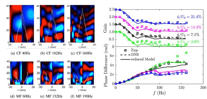 从控制论的观点来看,Crocco热声迟滞模型实际上是一种形式简洁的火焰传递函数,表征不同频率下速度扰动所引起的火焰热释放响应。在热声系统中,火焰传递函数对稳定性起决定性作用。近年来,中科院力学所的吕钰副研究员与乔正特别研究助理在摸索热-声-流相互耦合机制的基础上提出了一种基于输入/输出模态分析的火焰传递函数高效建模方法。利用线性算子给出了声波诱发的速度扰动场模态结构,并结合火焰运动学模型,仅用极低计算成本准确预测了火焰的频域响应。该火焰传递函数建模方法,可适用于任意火焰形态,与前人经验模型相比预测精度显著提升。该成果受到国际同行的认可,2022年被录用为在39届国际燃烧大会口头报告,并发表于Proceedings of the Combustion Institute 。