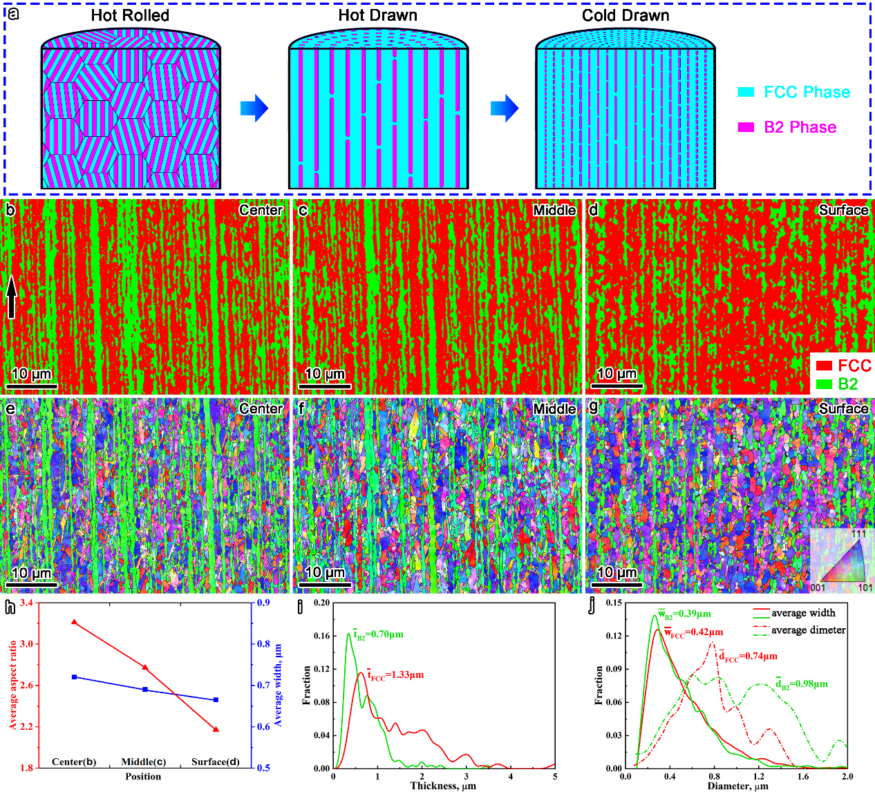 近期,中科院力学所戴兰宏研究团队在该问题研究上取得新进展。研究人员选择了具有片层结构的AlCoCrFeNi2.1共晶高熵合金,通过精心设计多道次拉拔工艺,成功制备出一种具有独特梯度片层结构的共晶高熵合金毫米丝材。丝材内硬相B2片层与软相FCC片层交替相间分布,从丝材外表面到芯部,B2片层几何特征呈现梯度变化 (图1)。为了进一步提高丝材的强塑性协同能力,研究人员精细控制了热处理的温度和时间,以促进丝材部分回复而抑制动态再结晶的出现。所研制的共晶高熵合金丝材不仅具有非常优异的室温强塑性能 (断裂强度1.85GPa,均匀延伸率12.1%),同时表现出更为突出的低温(77 K)强塑性能(断裂强度2.52GPa,均匀延伸率14.3%) (图2)。通过对变形前后的丝材进行EBSD扫描和KAM分析,研究人员发现介观尺度梯度非均质片层结构促使丝材内的几何必须位错(GND) 在变形过程中沿径向呈现梯度分布,即几何必须位错密度从表面区域向中心区域逐渐减小(图3)。这种梯度分布的几何必须位错密度可以产生显著的应变梯度强化效应,从而大幅提高丝材的力学性能。对比分析室温和液氮低温下丝材微观变形特征发现,室温下丝材内B2相变形以位错主导,FCC相变形则以位错和层错共同主导(图4);低温下丝材内B2相在变形过程中开启了大量位错交滑移网格,而FCC相则激活了细密的三维层错-孪晶网格(图5),多种位错变形机制的协同激活实现了丝材强塑性的同步提升。本项研究为高性能金属丝材开发提供了新的思路。