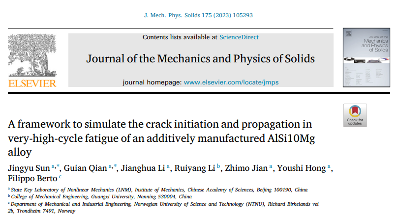 该研究成果近期以“A framework to simulate the crack initiation and propagation in very-high-cycle fatigue of an additively manufactured AlSi10Mg alloy”为题,发表在固体力学旗舰期刊Journal of the Mechanics and Physics of Solids 2023,175, 105293上(https://doi.org/10.1016/j.jmps.2023.105293),论文作者为中国科学院力学研究所孙经雨、钱桂安、洪友士等人。该项研究工作得到了国家自然科学基金(12002185,12272377,12072345,11932020)的资助。
