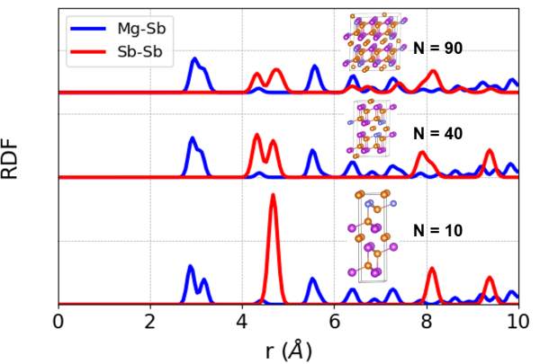 中国科学院力学所非线性力学国家重点实验室微结构计算力学课题组和中国科学院山西煤化所/中科合成油联合团队针对先前发展的化学无序材料的微结构预测方法---“辣搜方法”(npj Computational Materials 9, 12 (2023))进一步改进,增加了模型预训练和随机采样功能。模型预训练可以基于先前已有小样本小体系数据预训练机器学习势模型,提高了数据利用率和模型精度;在原来的枚举采样基础上增加了随机采样,随机采样可以使得“辣搜”方法的预测能力由有限体系扩展到准无限体系。利用改进的“辣搜”方法,我们探索了Mg3Bi2-xSbx (0 < x < 2)的原子晶胞结构。我们考察了在晶胞内原子数目N= 10、40 和 90三种不同尺寸的情况。计算结果显示三种不同尺寸下的结构均具有负的形成能,预示着它们在理论上是有可能稳定存在的。尽管形成能相似,但键序参数分析表明这些相的晶体结构非常不同。体系的尺寸在确定预测晶体结构的有序度方面起着重要的作用。随着体系尺寸的增加,预测结构的无序度也会增加。在较小的系统中,例如 10 和 40 原子系统,Sb 倾向于局域在有限数量的位点上,由于占据的位点数量有限,导致结构更加规则。然而,在较大的系统(例如 90 原子系统)中,径向分布函数表明Sb 在预测结构中的分布更加多样化,并且分布在整个结构空间的概率更高。我们的工作在理论上为后续研究Mg3Bi2-xSbx (0 < x < 2)热电性质提供了重要结构基础,同时为预测准无限体系的其他化学无序材料的微结构铺平了道路。