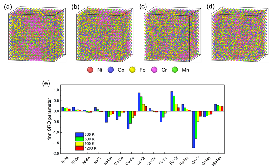 图 1 在(a) 300 K,(b)600 K,(c)900 K和(d)1200 K下NiCoFeCrMn中的SRO结构;(e)不同元素对的SRO指数